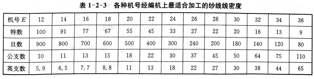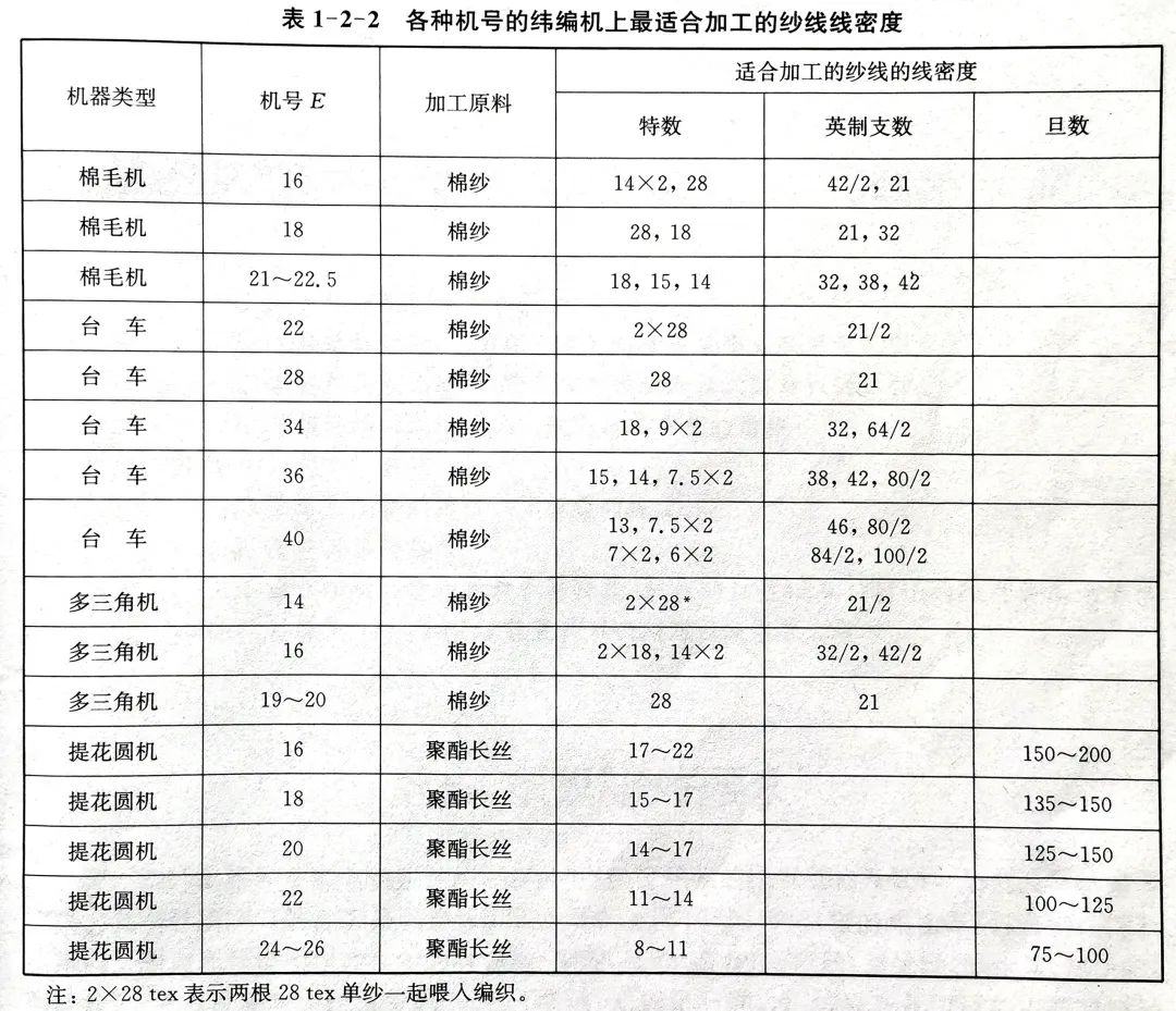 在實際生產中,一般根據織物的有關參數和經驗確定機號的針織機上最適合加工的紗線線密度,如表1-2-2所列為各種機號的緯編機上最適合的紗線線密度,表1-2-3所列為各種機號的經編機上最適合的紗線線密度。